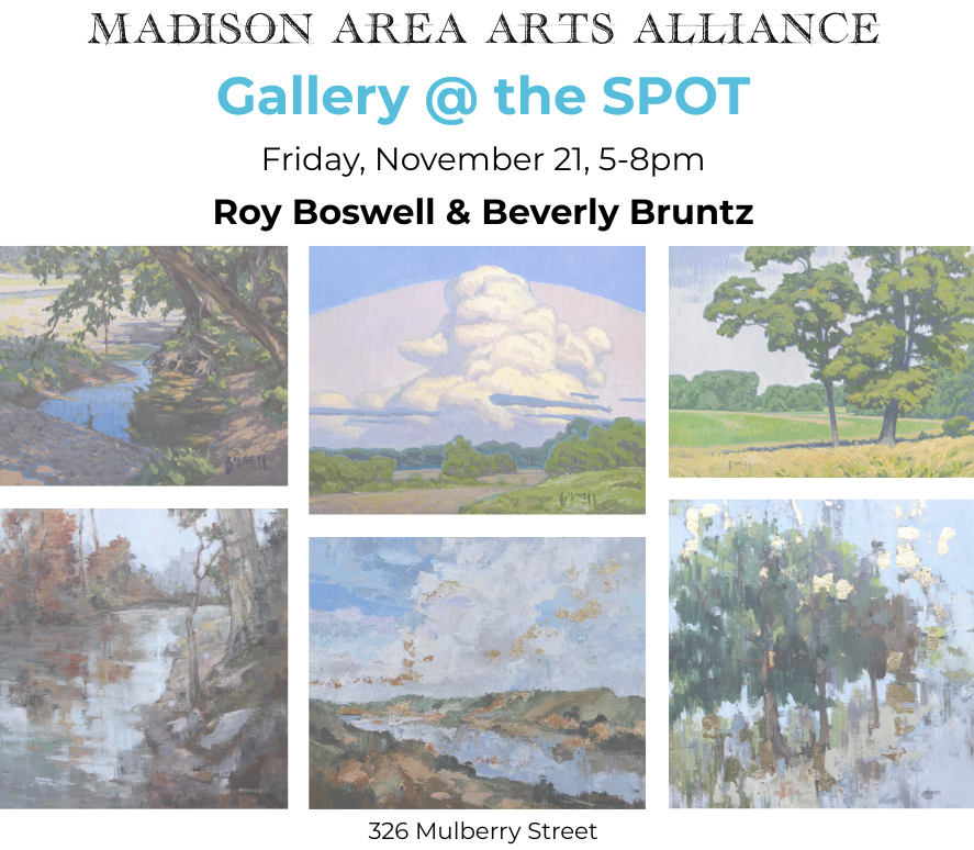 Join the Madison Area Arts Alliance as they celebrate the arts in Madison with the lovely plain air paintings of regional artists Roy Boswell and Beverly Bruntz! Both are award-winning artists, and this will be a show to remember for sure! Gallery @ the SPOT opening reception is Friday, Nov 21, 5-8 pm, and artists will talk about their work at 6 pm!